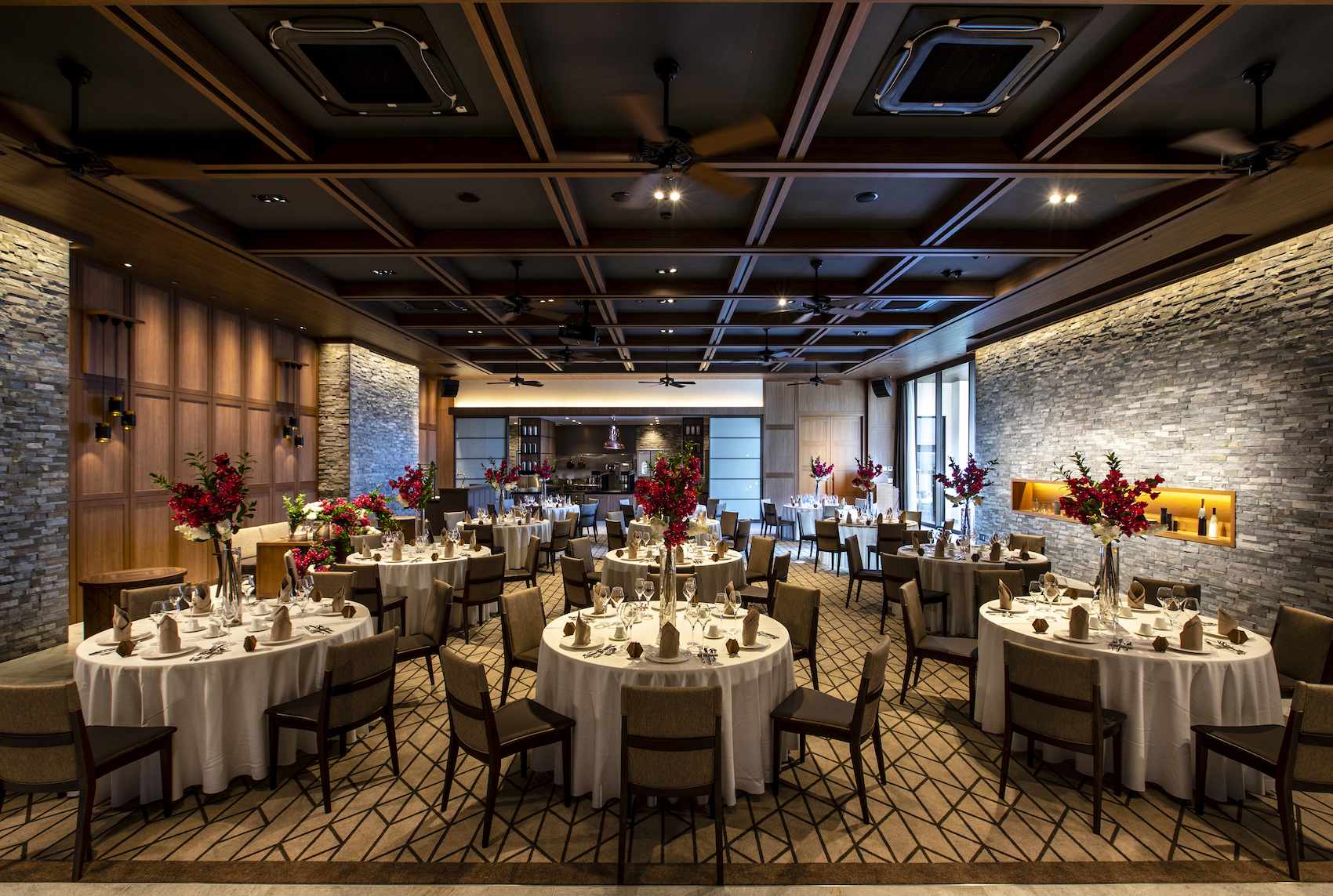 『East Terrace+Kitchen』はウォールナットの壁色とストーンベージュの石畳のインテリアに大型のウォークインキッチンを完備したアナザースタイルのメインバンケット。