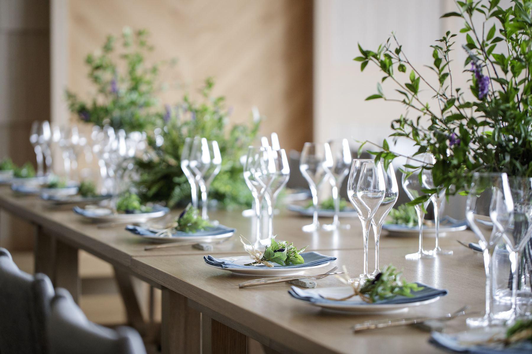 天井から吊るされたオリーブシャンデリアとメイン席を飾るビックフラワーアートがデビューします。グリーンいっぱいにコーディネイトされた会場にパープルラベンダー、かわいいホワイトレースカラーがふんだんにあしらわれ、よりカジュアルでリラックスできる女性らしい会場に生まれかわります。