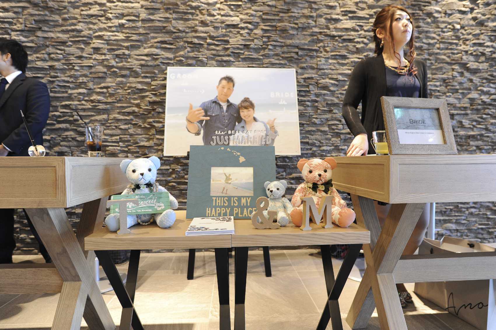 ALOHA!ウェルカム感満載の受付飾り!ハネムーンの際の写真を上手く活用♪