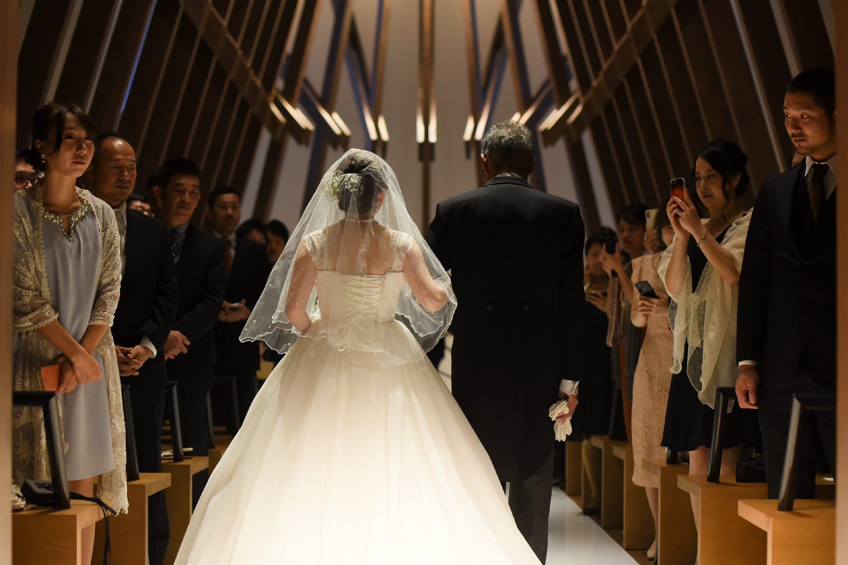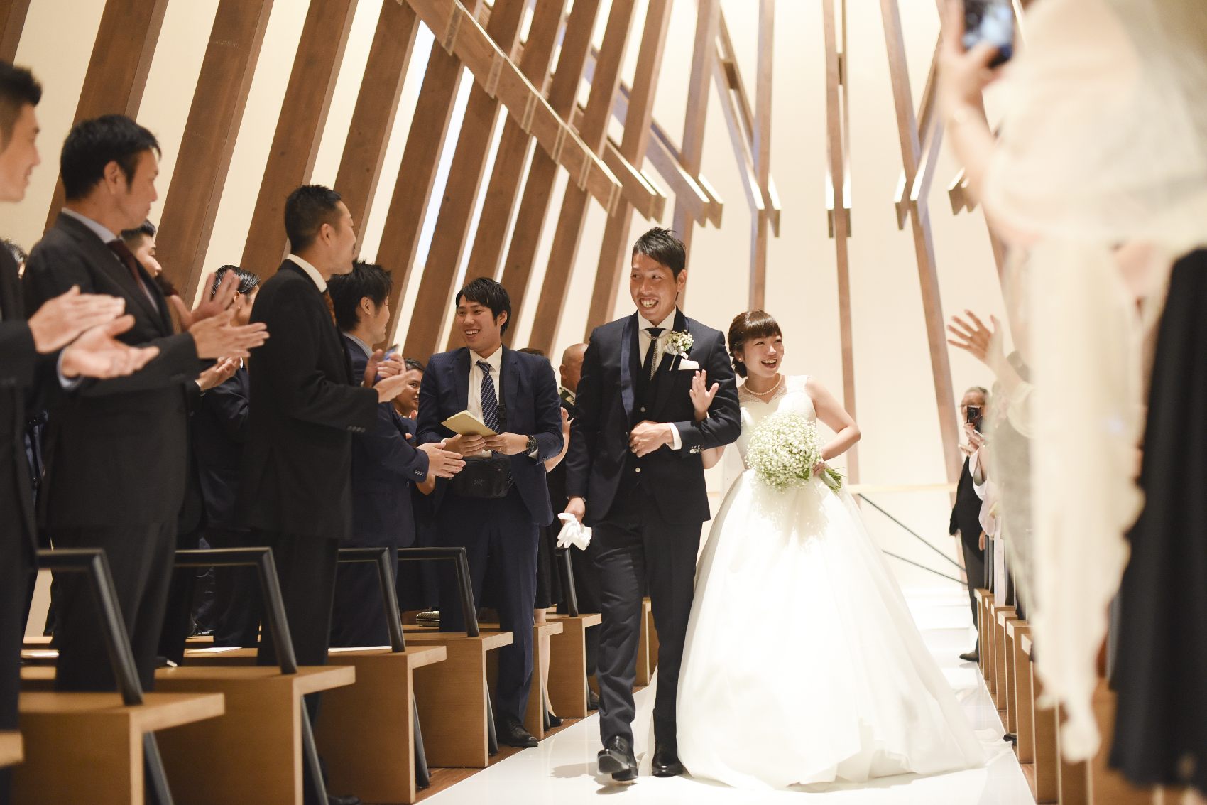 バージンロードを親御様と歩くのは、新婦様側だけではありません。ご家族とのこれまでのお時間を振り返る素敵なひと時は親御様も含め、印象深いシーンとなります。今回はご新郎様のリクエストで大好きな親御様にもエスコートをお願いしました。ゲストからも珍しいと好評で二人らしい挙式がスタートしました。