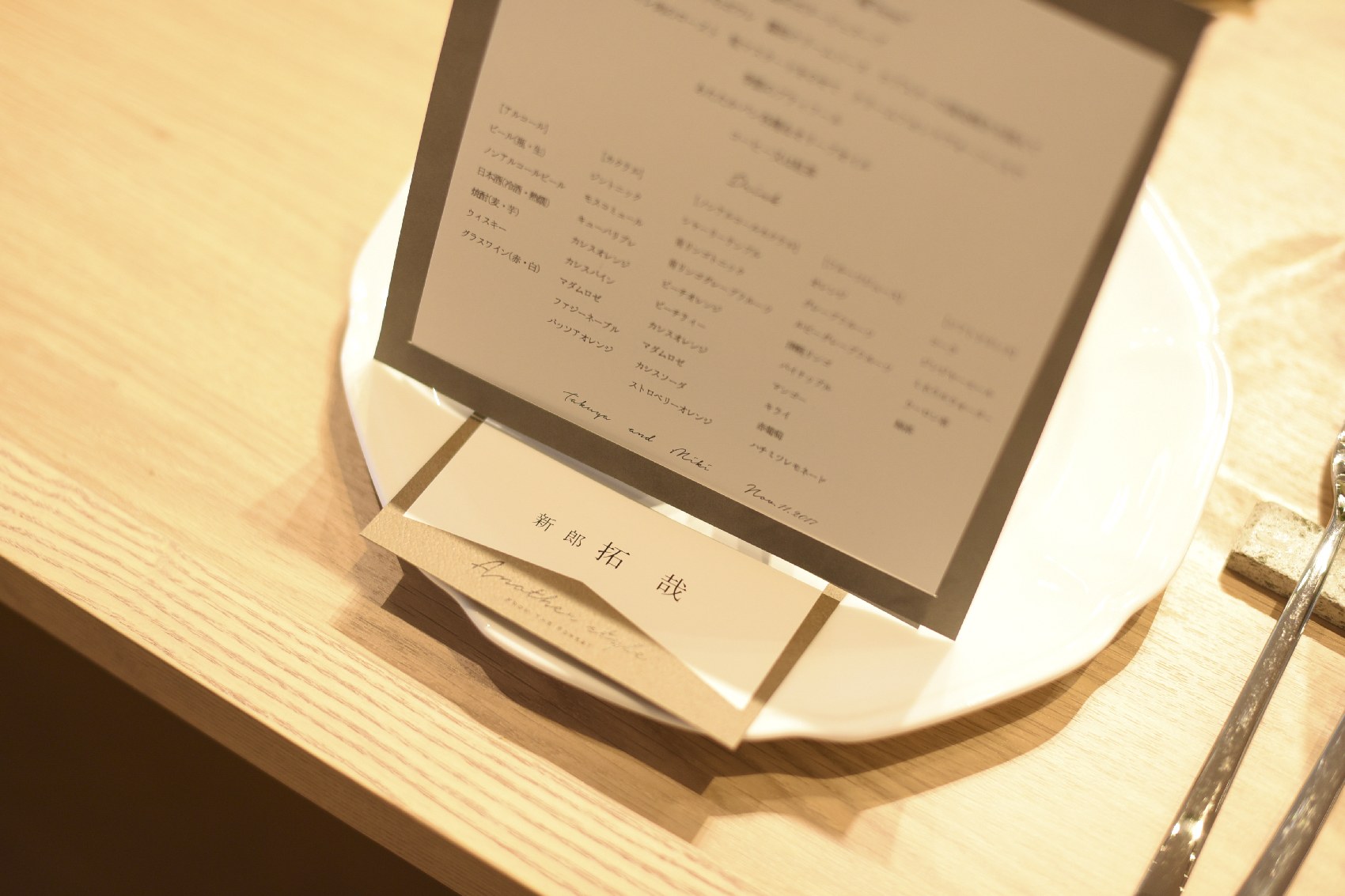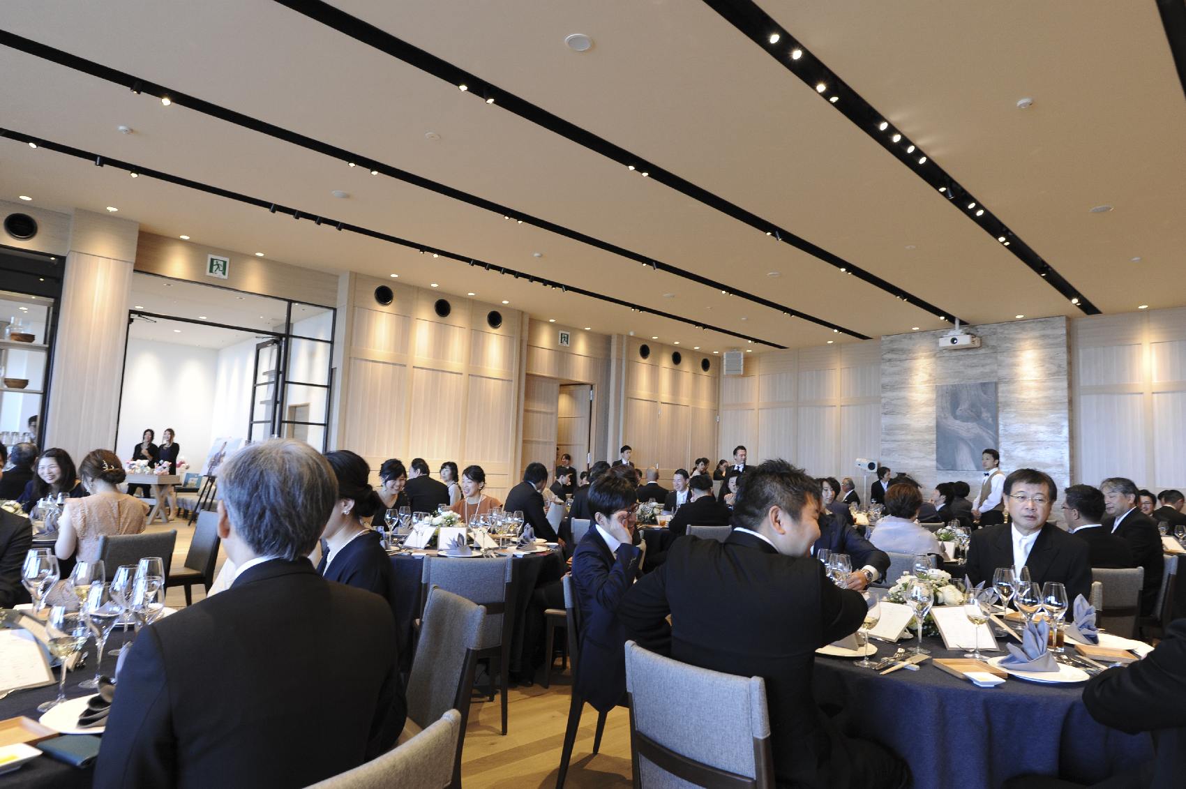 二人が選ばれた、会場は+Bar。やわらかい色味の木を基調としたシンプルな空間です。シンプルということは、二人のカラーも出しやすい♪会場のテーブルクロスはカジュアルな雰囲気が出せる「デニム生地」で!会場装花もグリーン×ホワイトで統一!爽やかな空間でパーティがスタートしました。