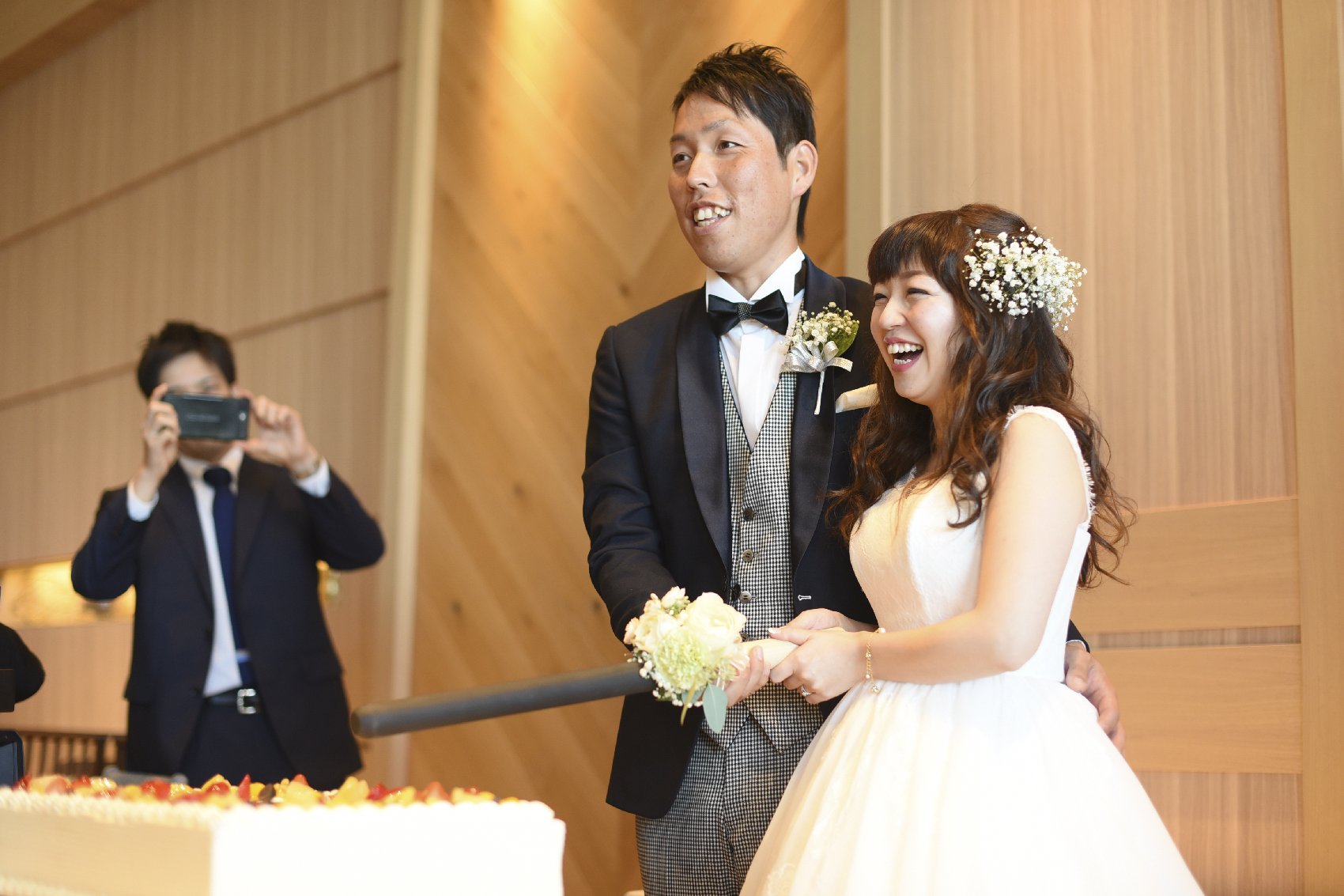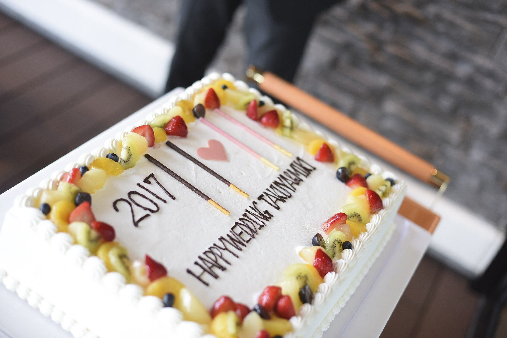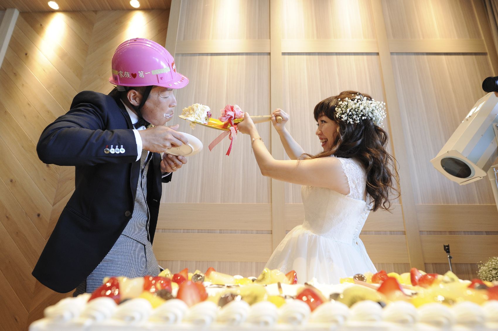挙式日にちなんでケーキには1111の数字がデザインされました。そして新郎様の職業は大工さん♪自ら作成された、木製のポッキーでケーキカットを行いました。定番のファーストバイトでは職場の皆様に作っていただいた愛のヘルメットを着用し、大きなスコップで大きな愛を受け止めていただきました。珍しいスタイルにゲストも大盛り上がりとなりました。