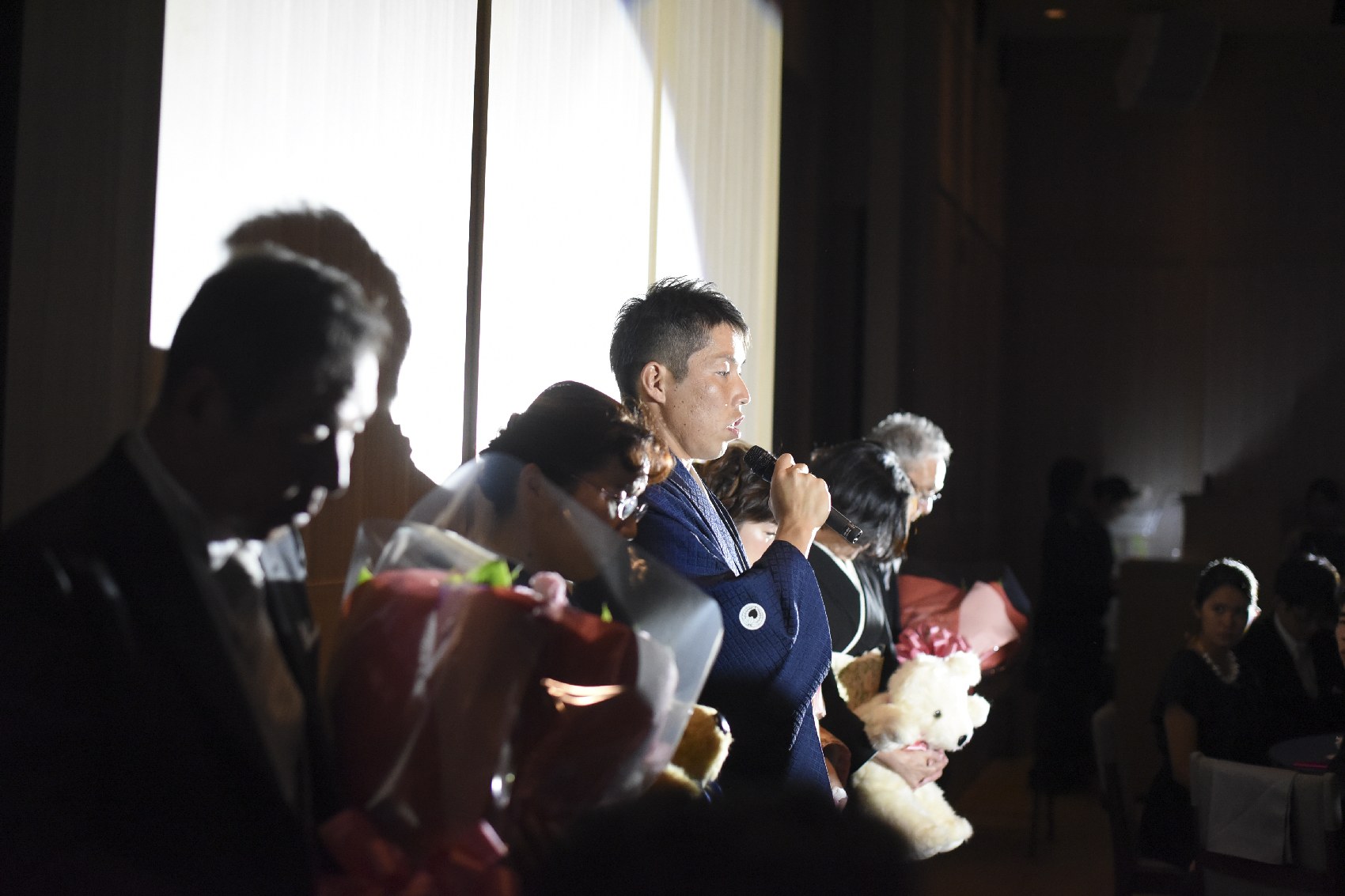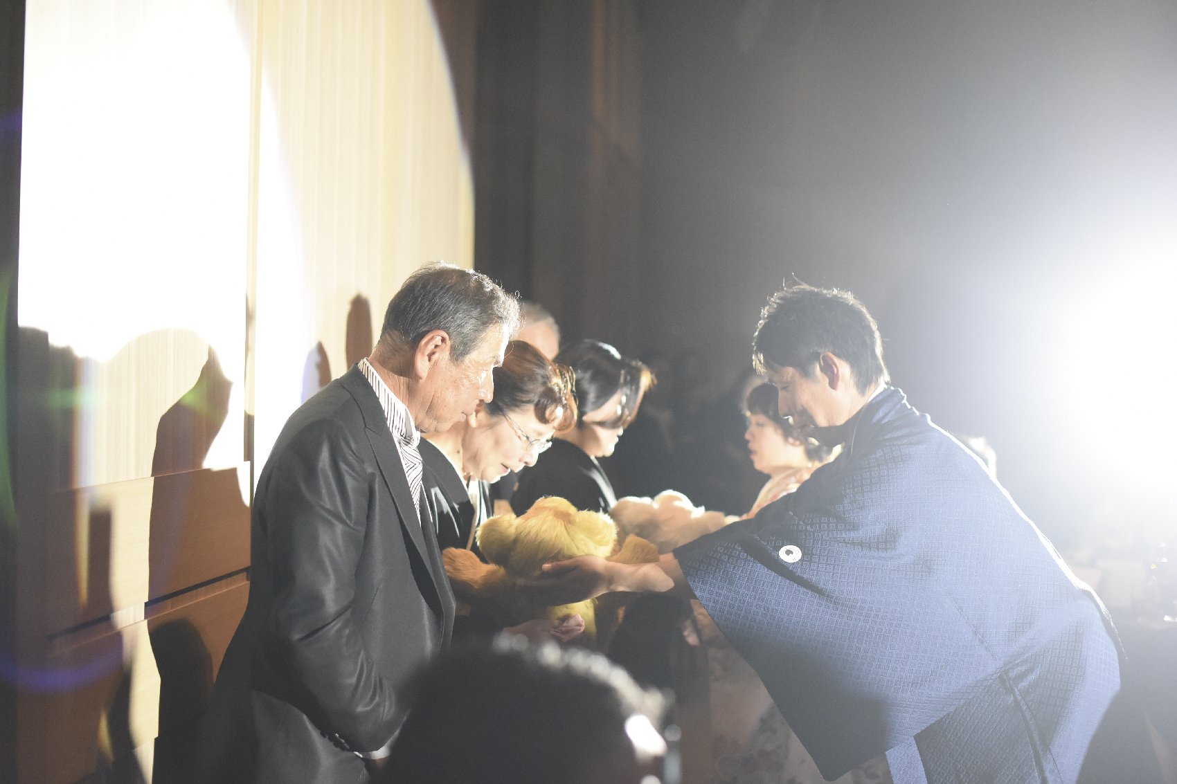 パーティーのラストシーンは親御様へのメッセージVTRからスタート。お二人とも、これまでの人生で一番愛を受けた感謝をメッセージとして伝えられました。会場中が感動シーンで包まれる中、親御様へお二人が生まれた時と同じ重さのドールを贈呈。これまでの子育てのありがとうが伝わる、心温まるシーンとなりました。