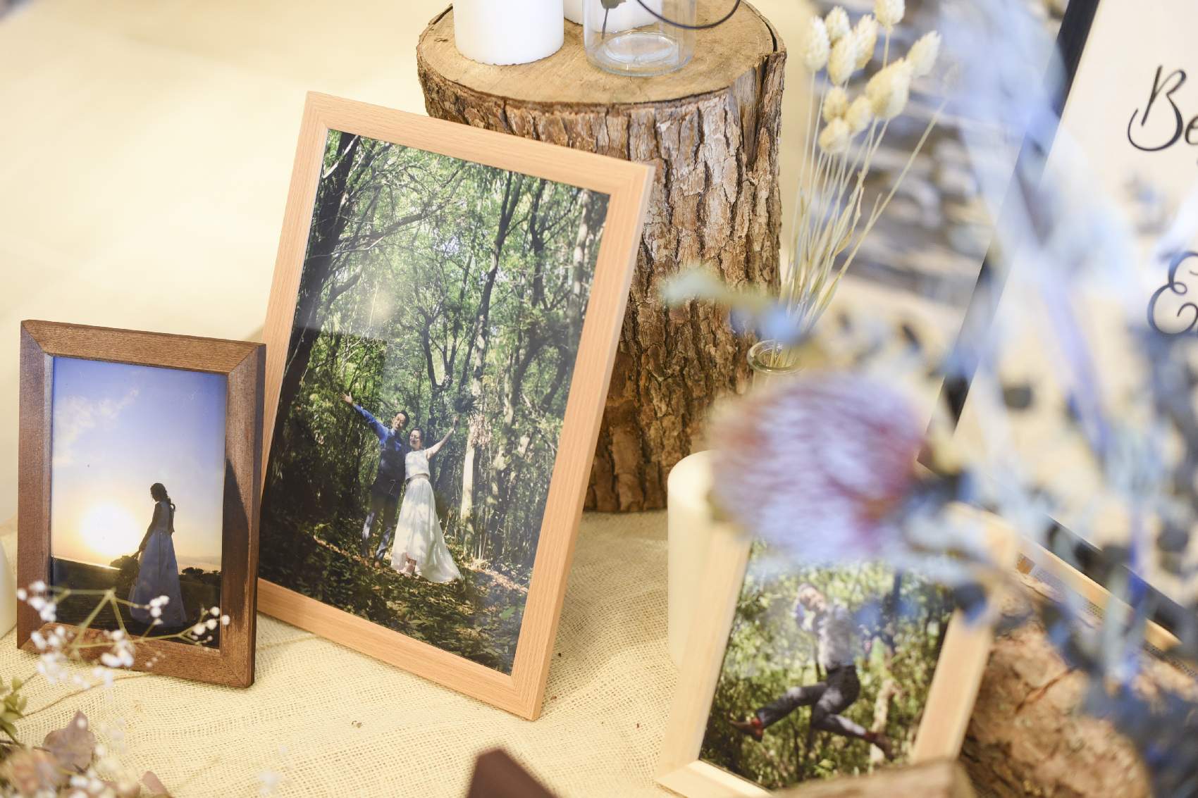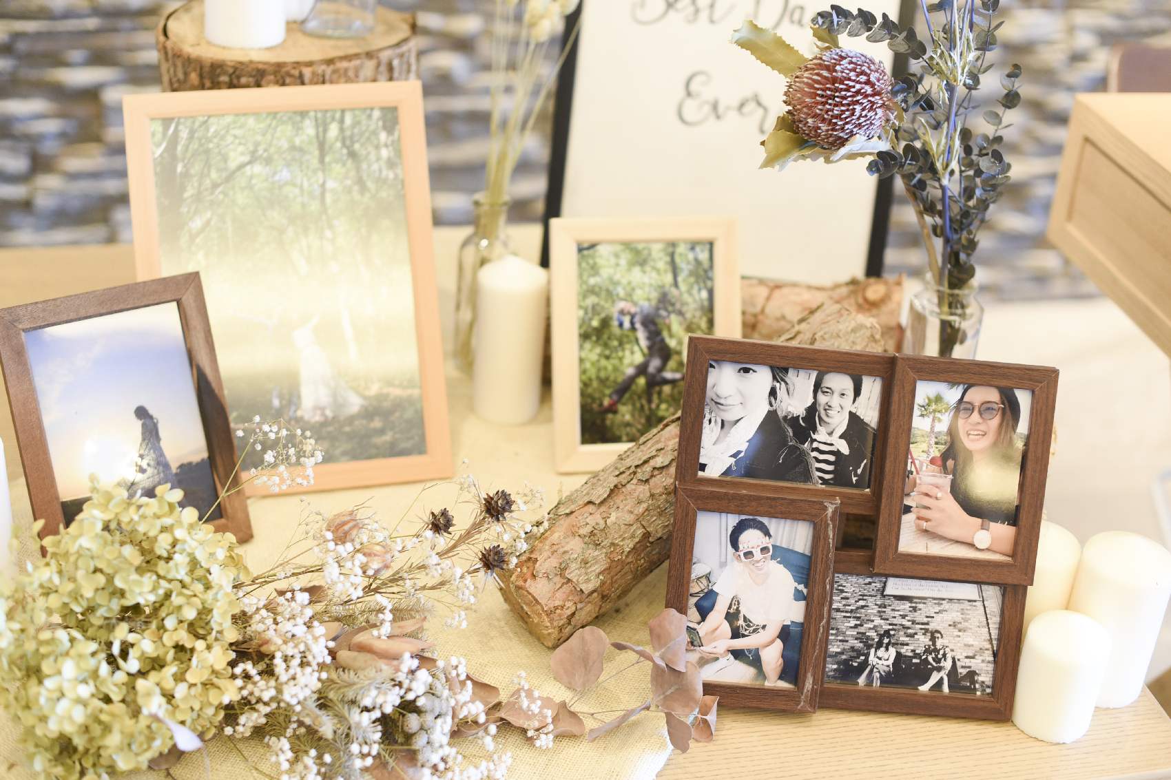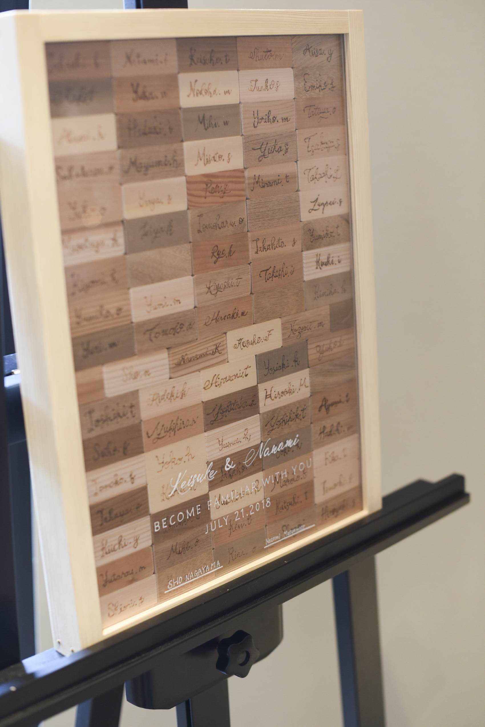 お二人が選ばれた結婚証明書は、木片で出来たオリジナルボード。受付にてゲストに埋めていってもらう。大切なゲストの名前が敷きつけられた、世界でひとつだけの宝物。