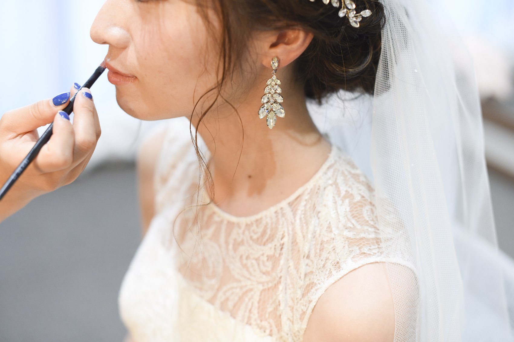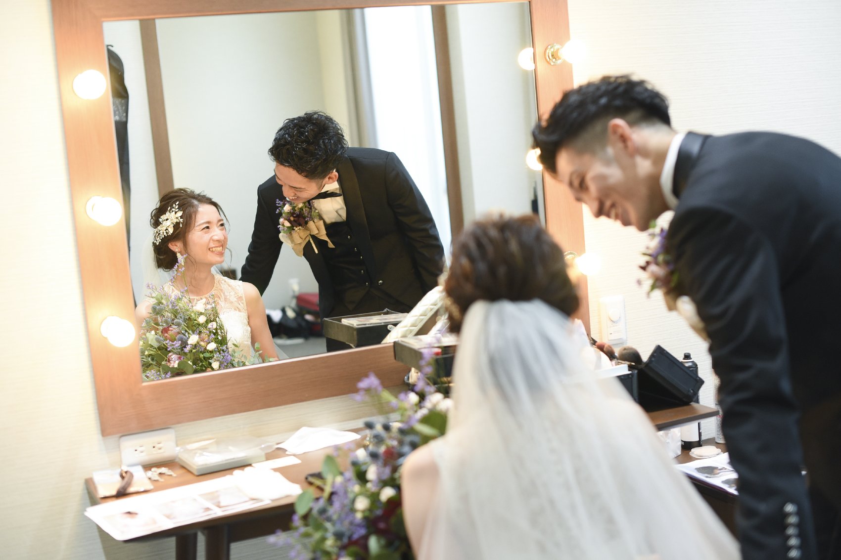 支度をしている間も、ずっと笑い声が絶えません!そんなお二人を見ていると、私たちスタッフまで笑顔に。こだわって選んだウェディングドレスにそでを通した時の花嫁様の表情。結婚することを一番実感する瞬間です。