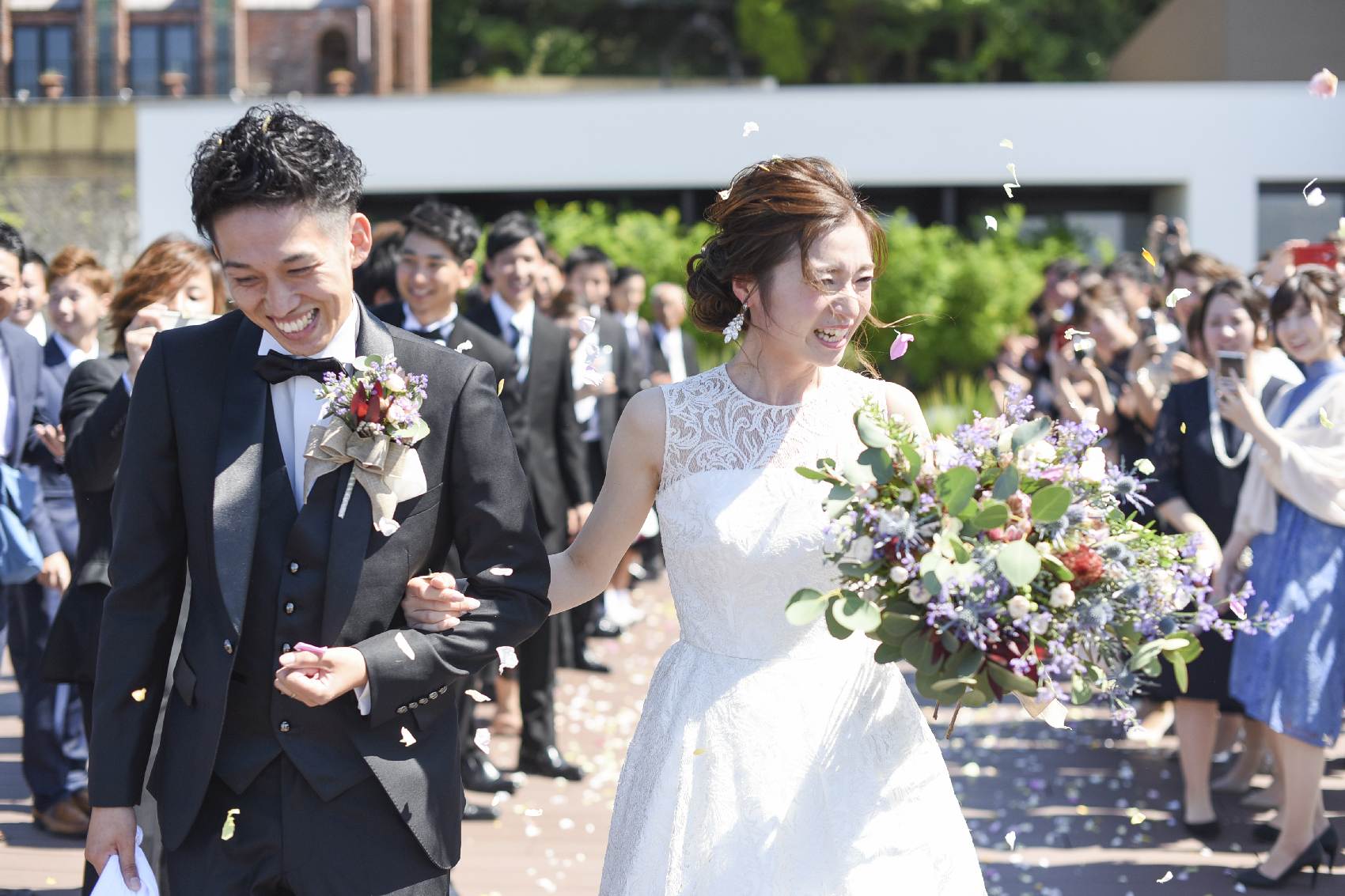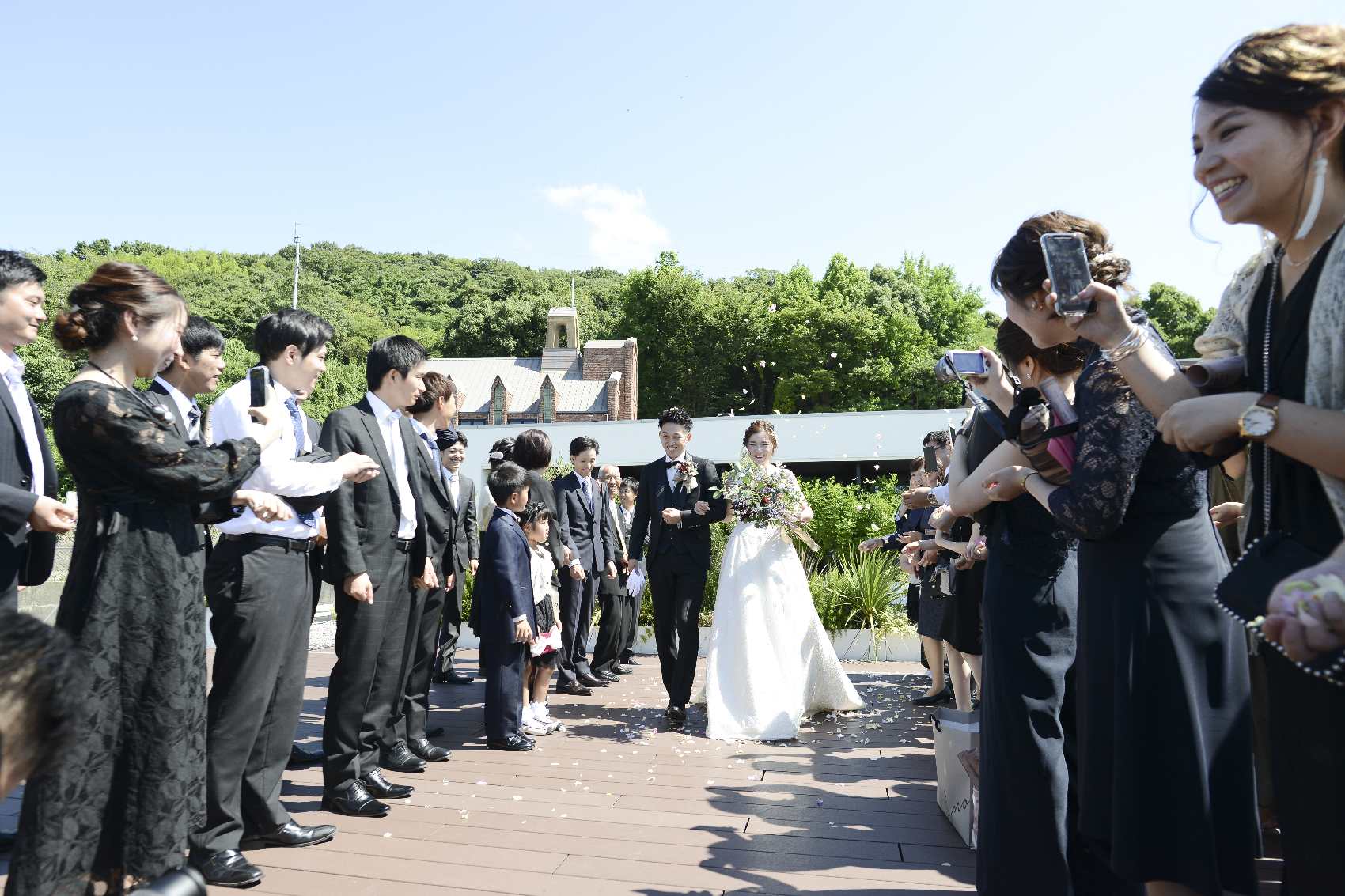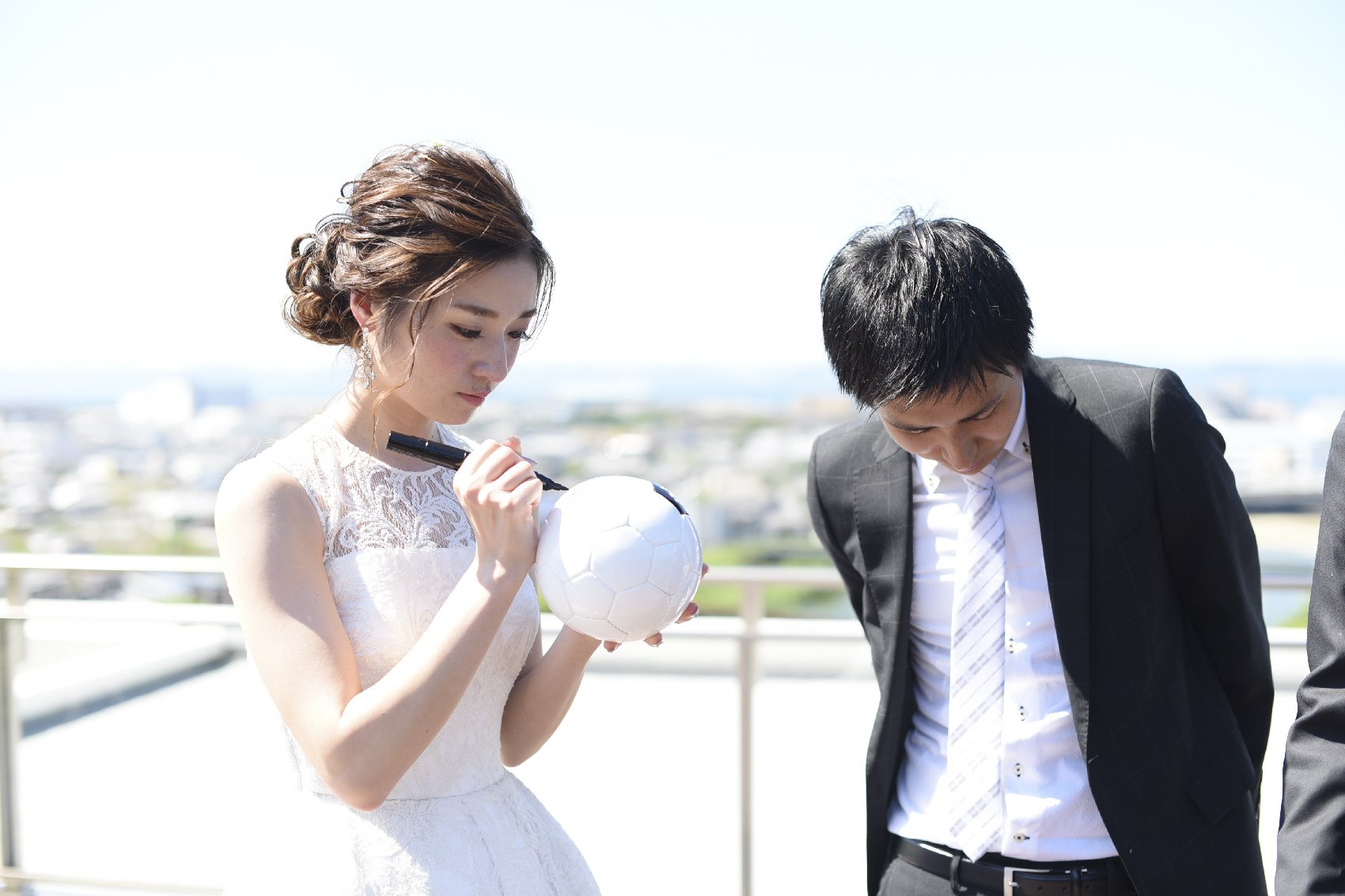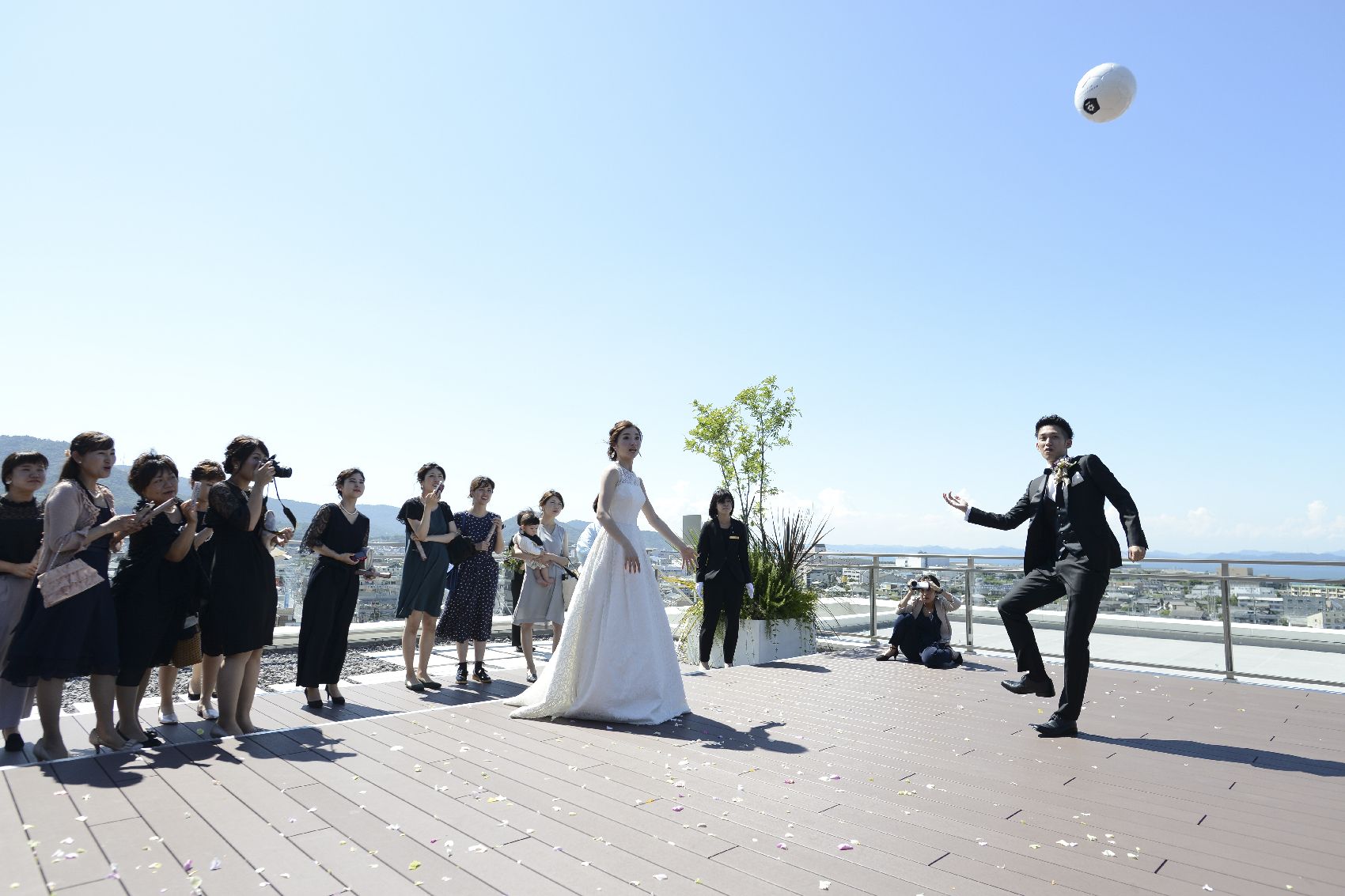 まさに天気もお二人の味方をしてくれていました。花びらが降り注ぐ中を、とびっきりの笑顔で歩かれるお二人。自然とゲストも笑顔になります。新郎様は特技のサッカーを披露!ボールを受け取った方には、その場でメッセージを書きプレゼント!ご友人一人一人を大切にされていらっしゃるお二人からのサプライズです。