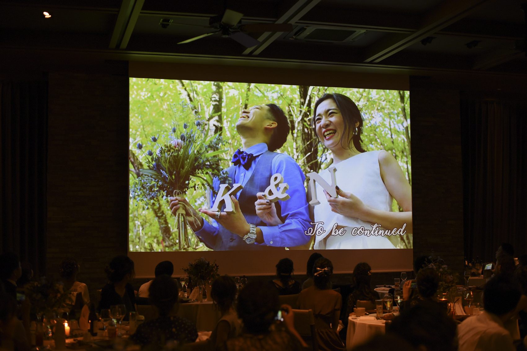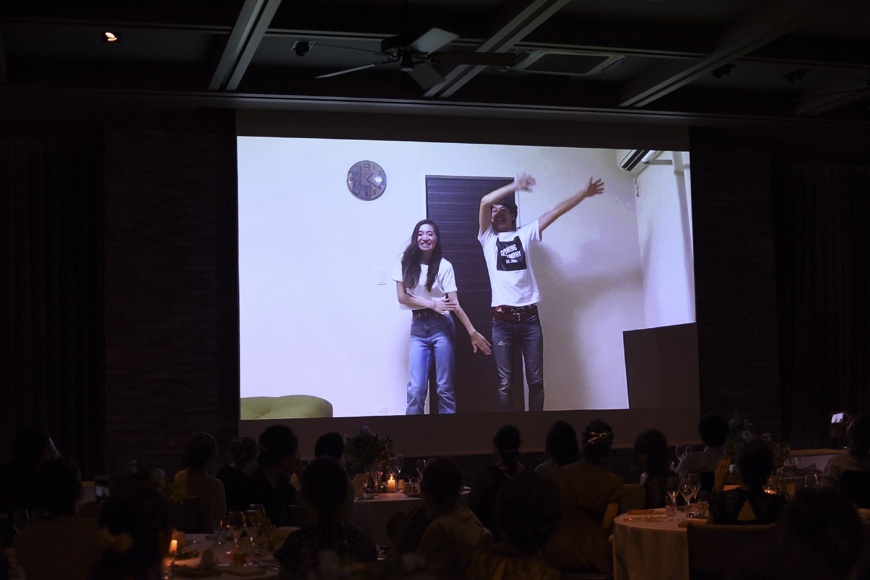 二人手作りのムービーでまずは一笑い。お二人がおっしゃっていた、ゲストを楽しませる、笑わせる結婚式が始まります。
