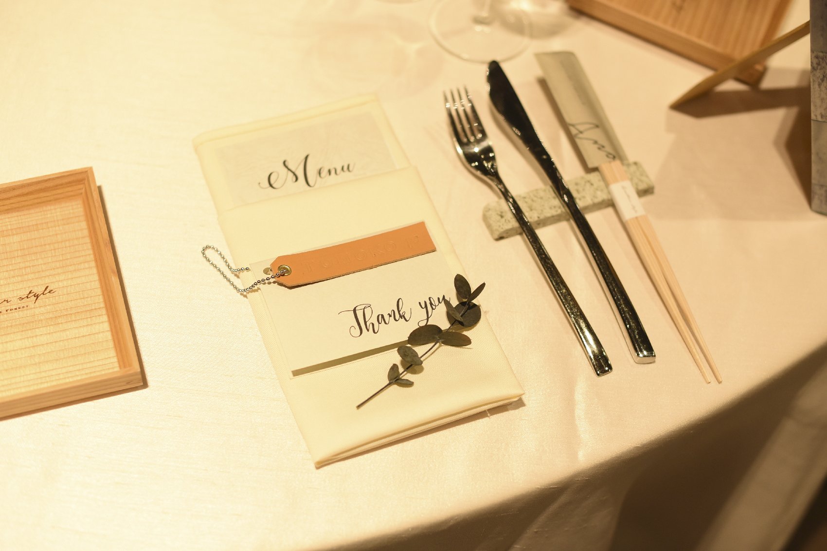 会場の中は二人のイメージにピッタリのカジュアルな空間。そしておふたりが一生懸命作られた、革で出来た席札がお出迎え。普段も使用できるようにと、ボルトチェーンも付けられています。そして、なにより、この空間の中には、お二人の笑顔がよく似合います。ゲストからのスピーチや余興に笑わされ、泣かされ、今までお二人が周りの方を大切にされてきたことが、わかりました。