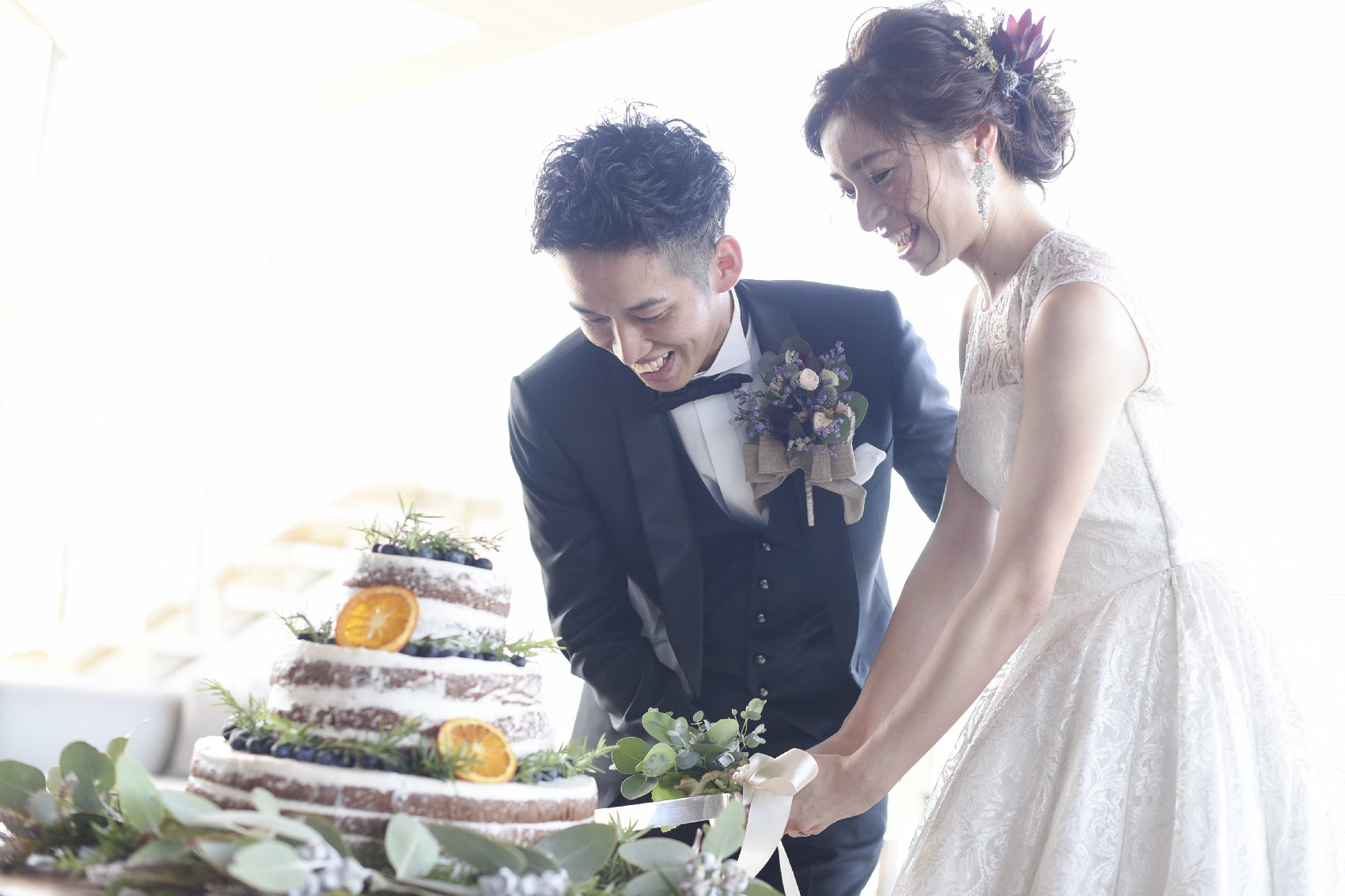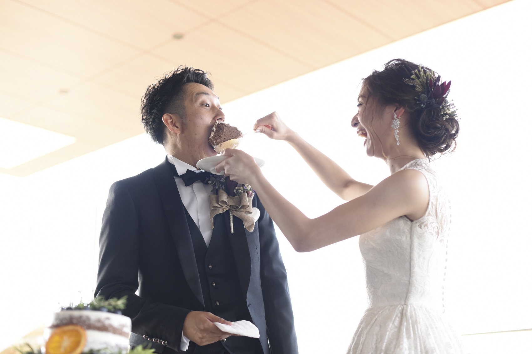自然を感じてもらえるよう、テラスに出てのウエディングケーキ入刀を選ばれました。青い空と海をバックに、ケーキがとっても映えます♪ファーストバイトの時には、『あ~ん』と、大きな声で掛け声をくださったゲスト様。その場にいる方全員が、盛り上げてくださっていました。
