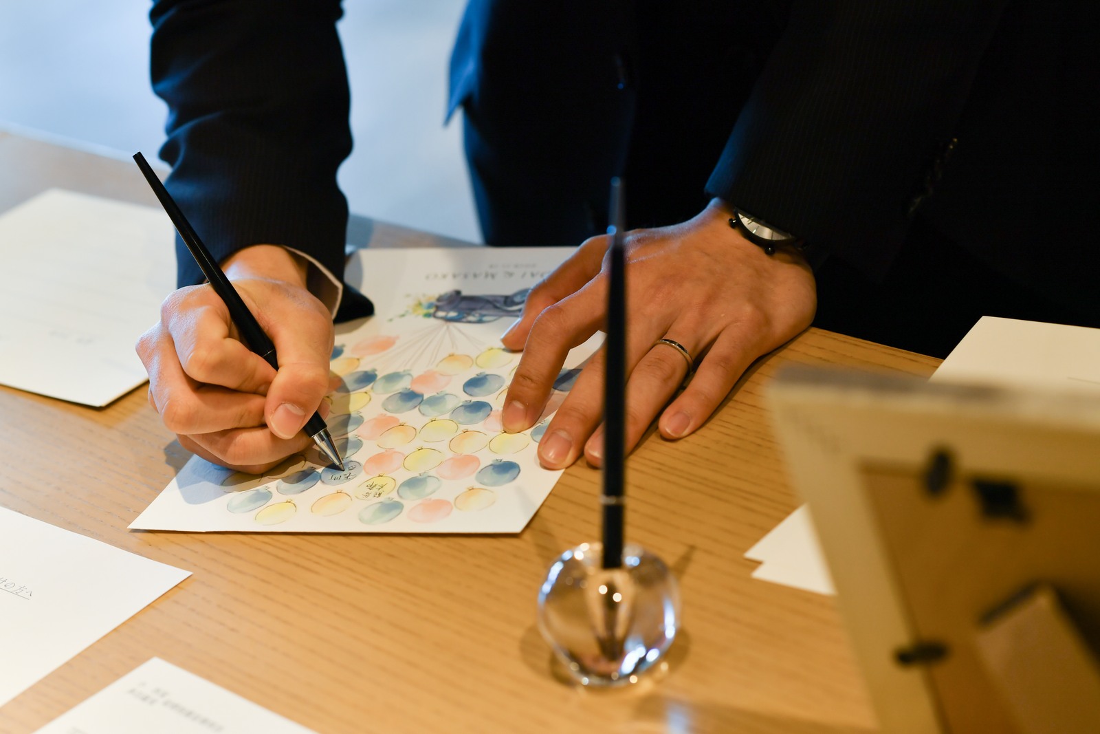 おひとり様おひとり様丁寧に結婚証明書にお名前を書いていただき、アナザースタイルオリジナルの席次表を手にお二人との思い出をお話しいただきながらゆっくりとお待ちいただきます。