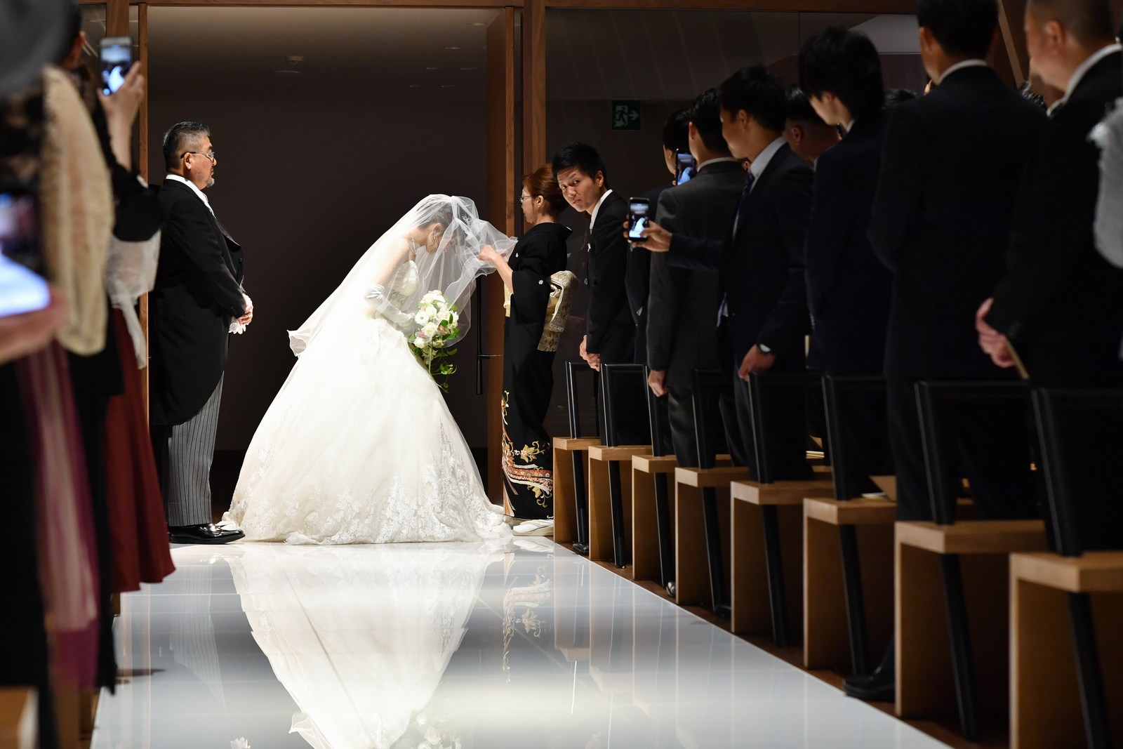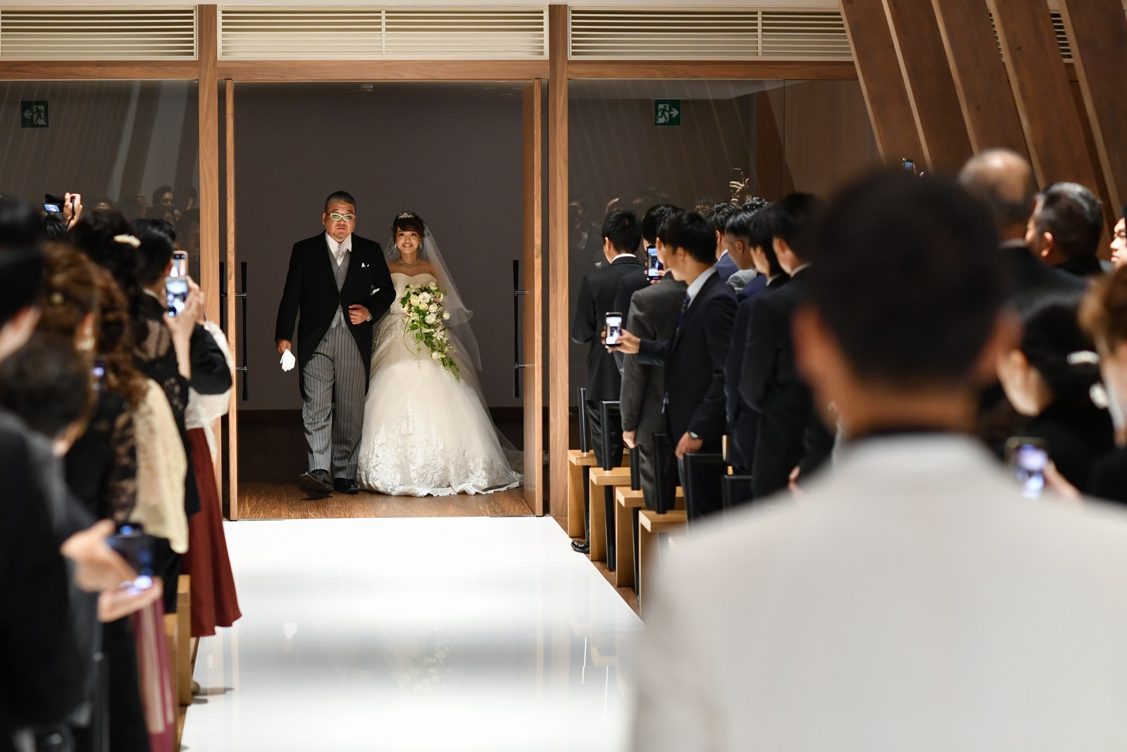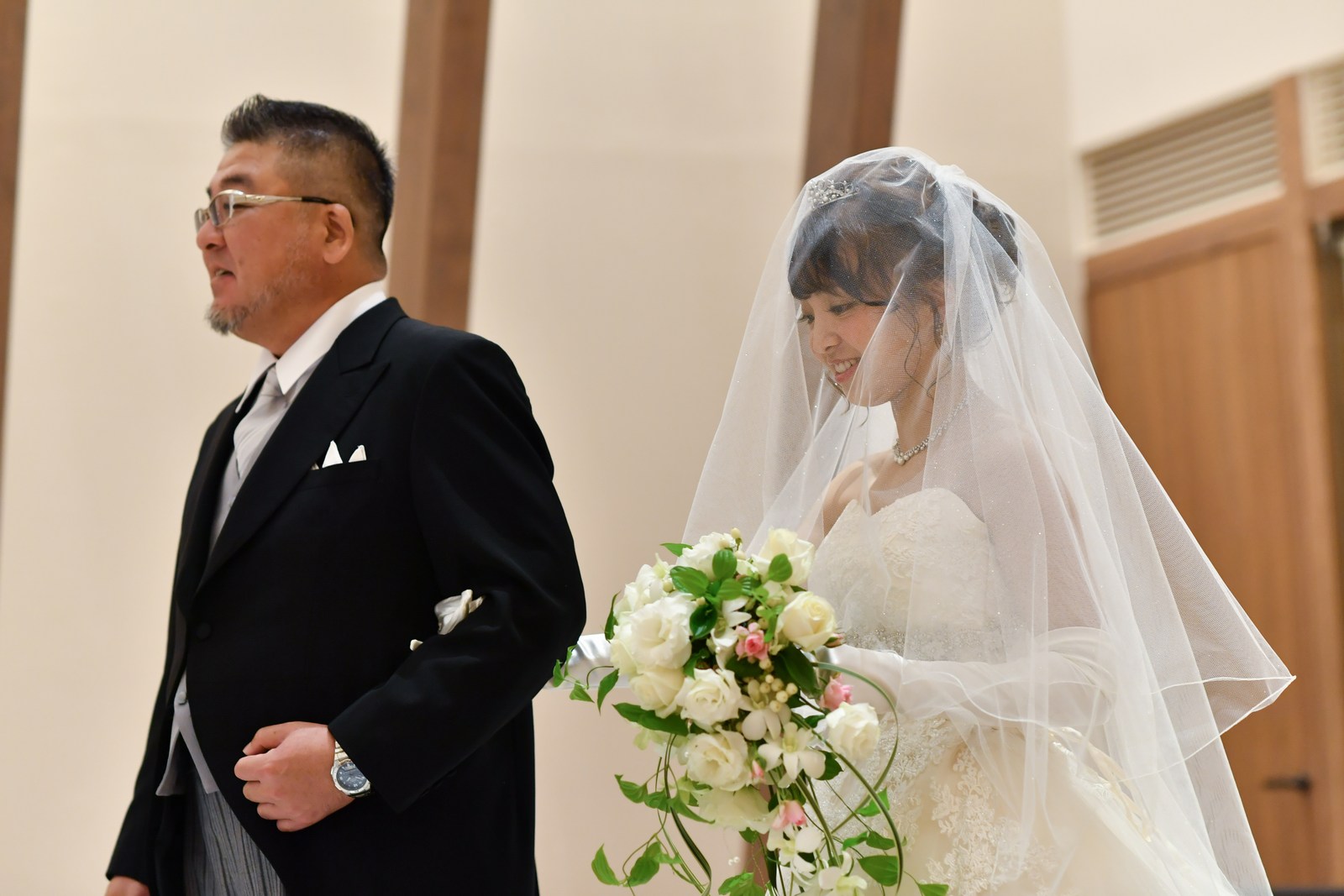 新婦様の恩師の方からの手作りブーケと共に、お父様と一緒に今まで歩んだ人生を振り返りながら新婦様入場。