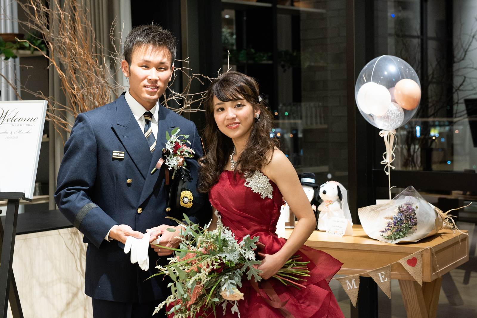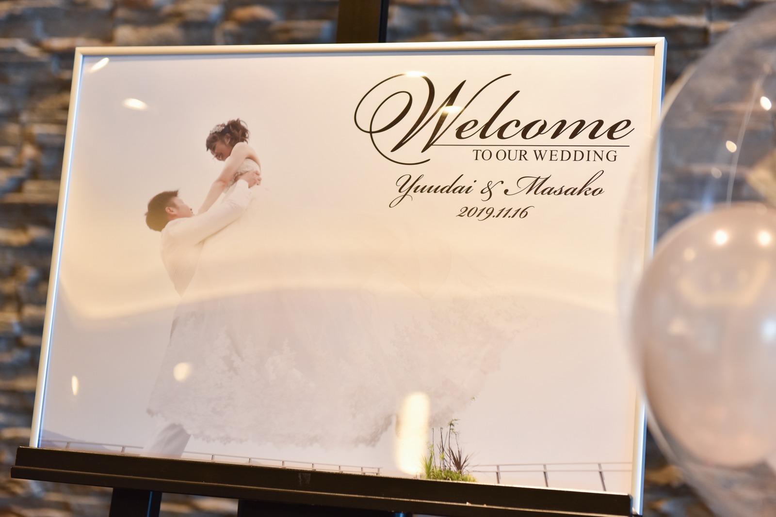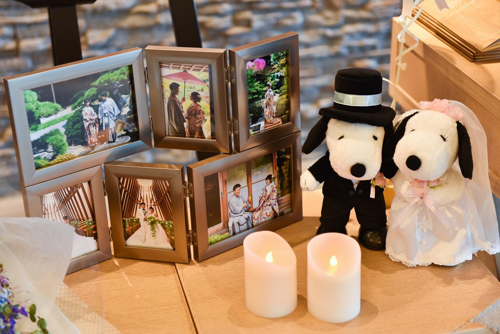 新婦様が大好きなスヌーピーのぬいぐるみ、ウエディングドレスが印象的なウエルカムボードがお出迎え!
