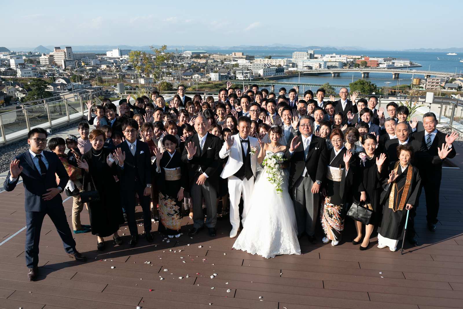 今人気のスカイフォトで高松の街並みと瀬戸内海そして、お二人とゲスト皆さま一緒に収めました!