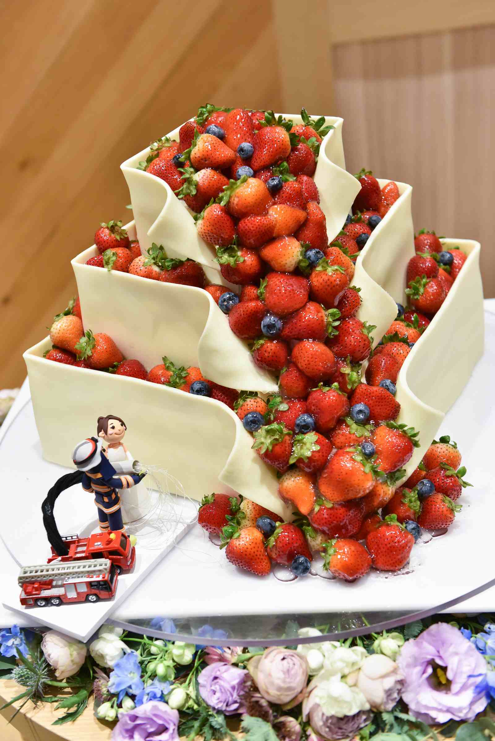 甘いものとサプライズがお好きなお二人がこだわり抜いたのがストロベリーとベリーがたっぷりの生ウエディングケーキ。