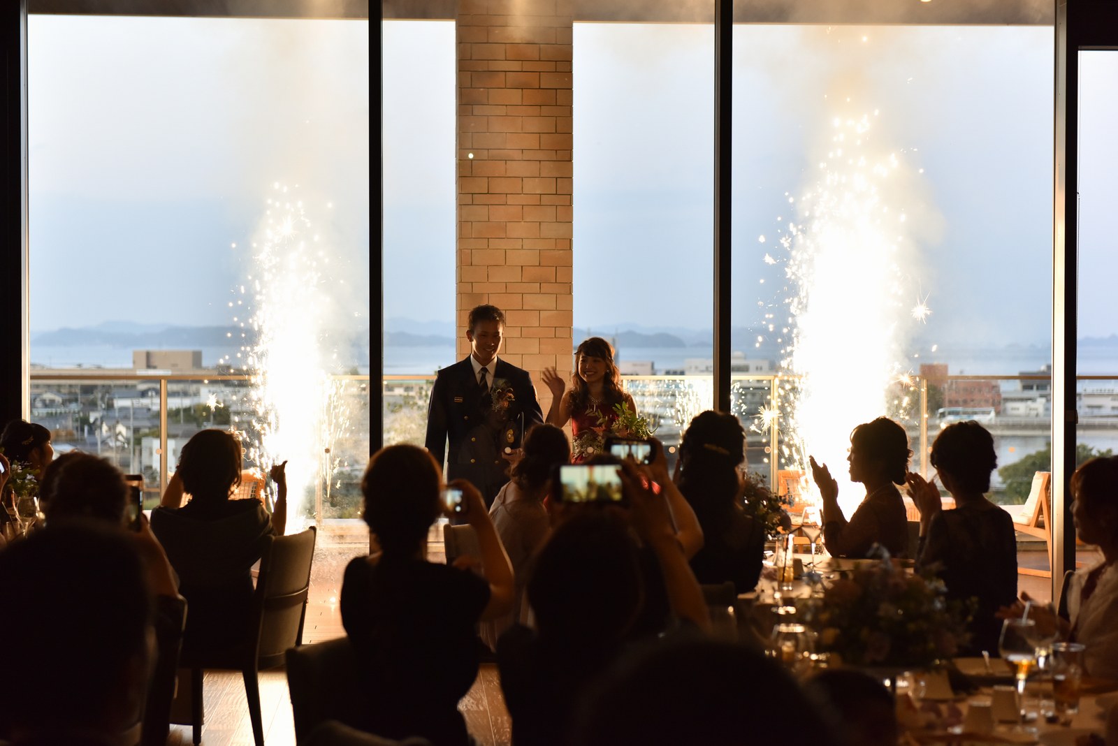 どこから登場なのかなと皆さま思っていると、カーテンが開き目の前にはお二人そしてキラキラ輝くファイヤーセレモニー!